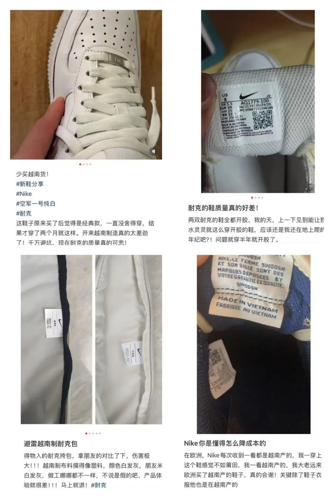 而且,耐克近年来把工厂大规模从中国搬到越南,成本是降了点,但代价也很大。社交媒体上随便一搜,就有很多吐槽越南工厂熟练度和品控不行的帖子。