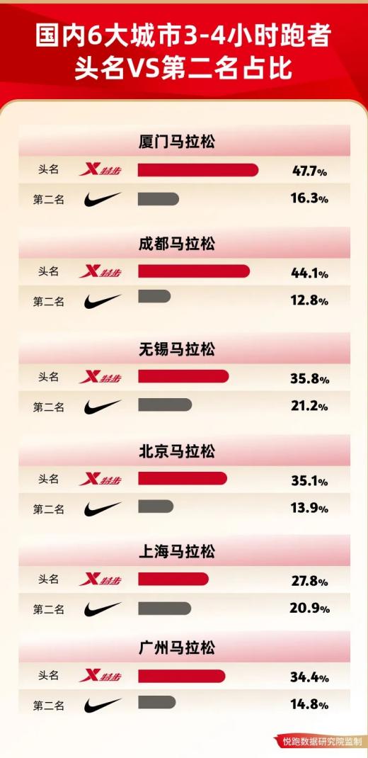在去年北马的时候,《节点财经》的研究员有一个观察,国产跑鞋的占比首次突破半数,达到57.3%。悦跑数据研究院的统计显示,国产运动品牌特步在厦门、无锡、成都、北京、上海、广州6场国内高水平马拉松赛事中,实现“破3”选手穿着率占比“6冠王”,国产品牌成为这些大众精英马拉松选手的首选。