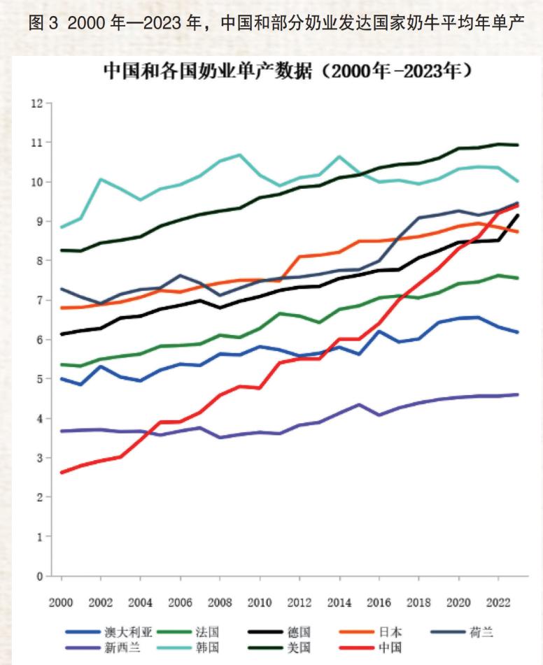 经过20多年的深耕和突围,我国奶牛年单产水平从2000年时不到美国同年的1/3,跃迁到2024年和美国持平。
