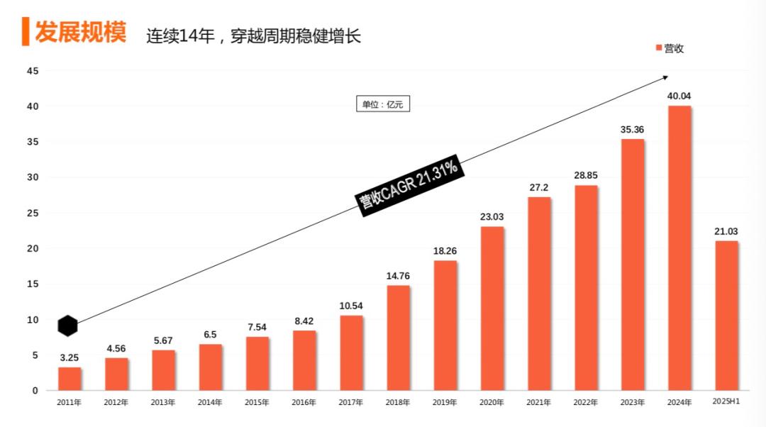 拉长时间轴,过去十四年(2011-2024年),比音勒芬营收从3.04亿元扩大到40.04亿元,年均复合增速(CAGR)24.5%,且期间的每一年都是正增。