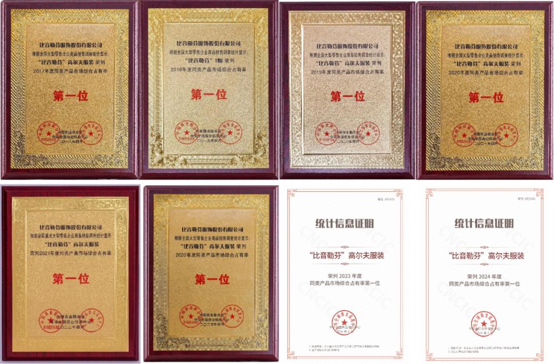 中国商业联合会、中华全国商业信息中心统计,高尔夫服饰品类,比音勒芬连续8年(2017-2024年)蝉联市占率榜首。