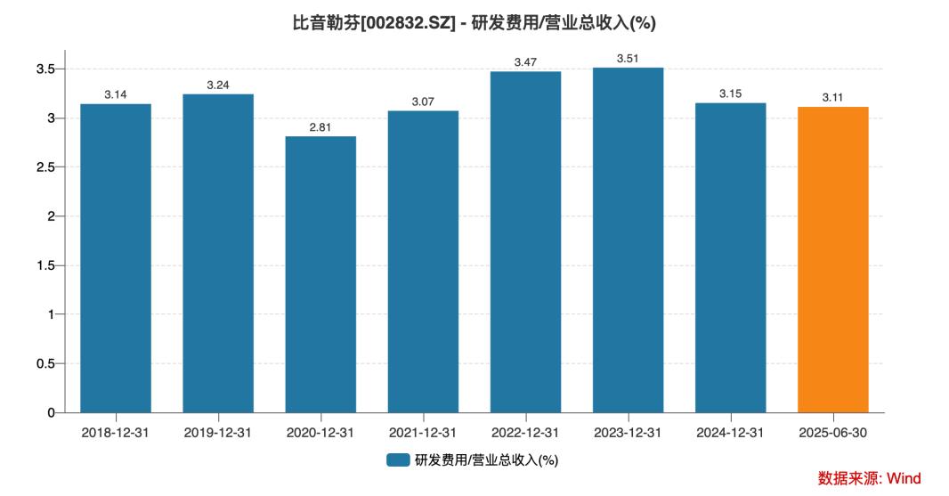 在服装行业普遍 “轻研发” 的当下,比音勒芬的 “慢哲学” 还体现在对产品研发的长期坚守。比音勒芬2020 年 - 2025 年上半年,比音勒芬累计研发投入近 6 亿元,近四年研发费用率分别为 3.07%、3.47%、3.51%、3.15%,这一比例不仅远远高于行业平均水平,甚至超过不少科技型企业。研发投入是企业保持创新能力的重要保障,然而研发投入并非越多越好,关键在于投入的有效性。
