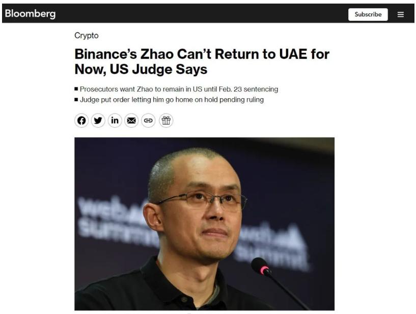 图注:Bloomberg报道截图(根据2023年的裁决,承认了与加密货币交易所币安有关的刑事指控的该公司创始人赵长鹏目前必须留在美国)