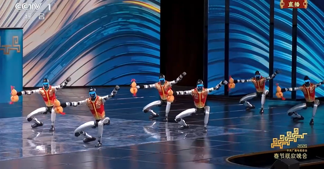 今年是宇树科技第三次登上春晚舞台。在主会场的《武BOT》节目中,宇树G1与H2两款人形机器人与舞蹈演员共同完成了一场“人机共舞”的表演。其中G1展示了棍法、拳法、剑法、醉拳等一系列复杂套路,而H2则进行了剑法演绎。在义乌分会场,宇树的机器人还完成了角色化表演:H2扮演齐天大圣孙悟空,以吊威亚的方式登场;B2-W机器狗则扮演“祥云”,为观众营造出奇幻的年节氛围。