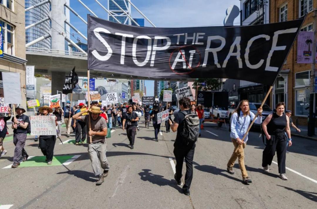 3月份,就曾爆发过一场美国史上最大规模的AI全球抗议活动,200人横跨Anthropic、OpenAI、xAI,高喊“停止AI竞赛”!