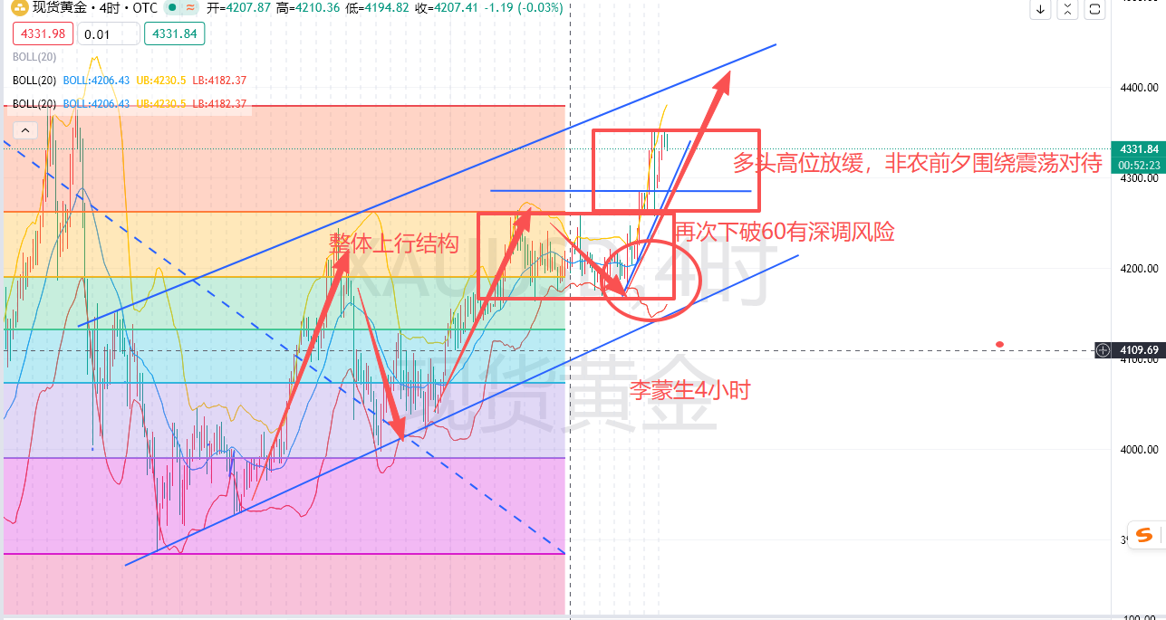 技术上多头高位开始放缓,整体结构继续看震荡上行,非农数据公布前就围绕高位震荡思路先对待,短期压力大家且关注4360,如若破位那么下一个目标看向4400关口!下方短期支撑关注4280,重点支撑关注4260,随着时间的推移,多单参与根据临盘情况4260-80区域灵活进场即可,下破60有延续深调风险同时下方云层支撑较多,能否再次切入多尽量根据届时情况抉择!非农数据公布前先不要过度解析,就围绕震荡短线处理即可,一步步来切勿操之过急。目前行情稳定下来了,空单也是有机会参与的,算不上逆势!