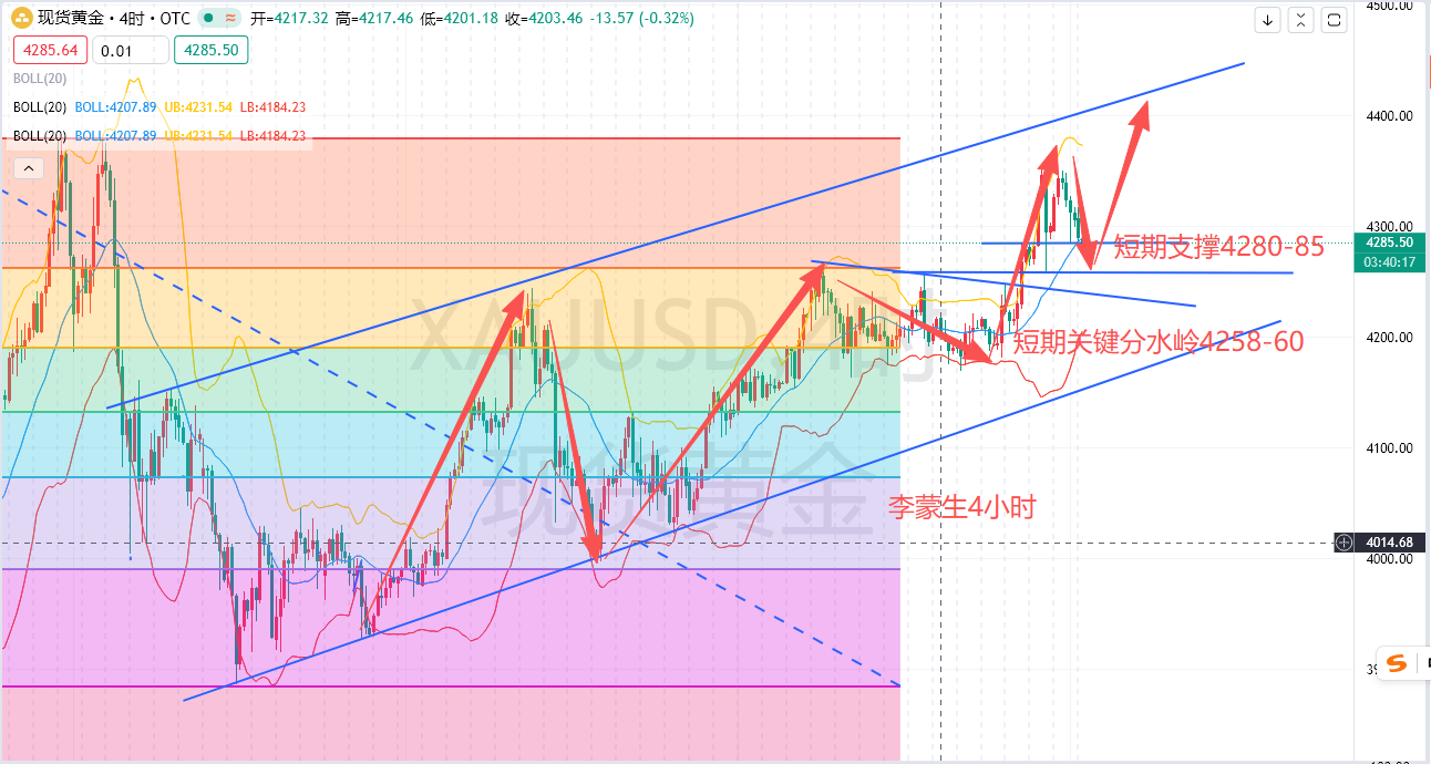 黄金技术上,前没太多要说的,保持震荡上行思路不变,短期支撑关注4285昨日低点,短期重点支撑则是关注4260-58,日内就依托2个位置之上短线包括中长期看涨,上去之后注意保留点底仓即可,近期行情波幅较大各位注意轻仓操作,昨晚给出的4300-05一带多下破85损的单子即便短线上也是获利,震荡行情偏短线处理即可,主要就是还是围绕低多,非农数据如若双重利好黄金再作高位跟进也是来得及的。