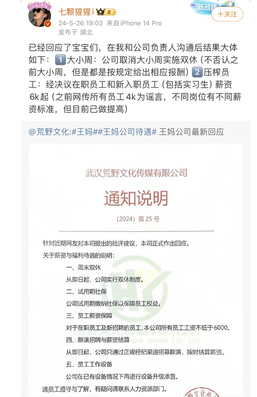 事件刷屏热搜之后,荒野文化和王妈也进行了回应。荒野文化表示,公司从即日起开始实行双休,全员工资最低6000元,群演也从正规渠道招聘,并且支付工资,试用期也给员工交社保,并且给员工升级办公设备。
