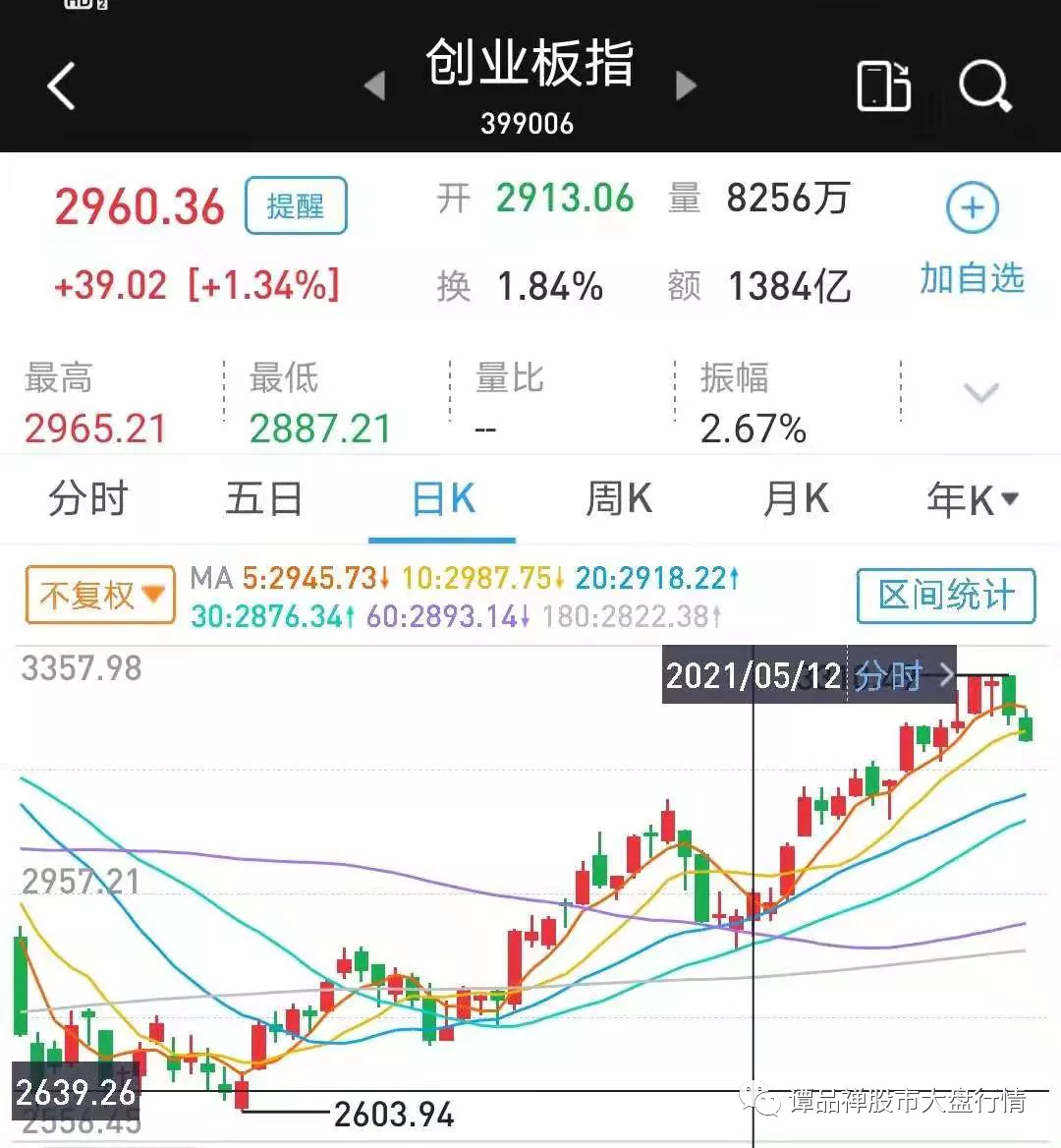 从上面上证指数和创业板指数截图可以看出,5月12日、13日是不是低点(可对照基金K线来看),后面是不是大涨行情。那么老谭易测有没有提示: