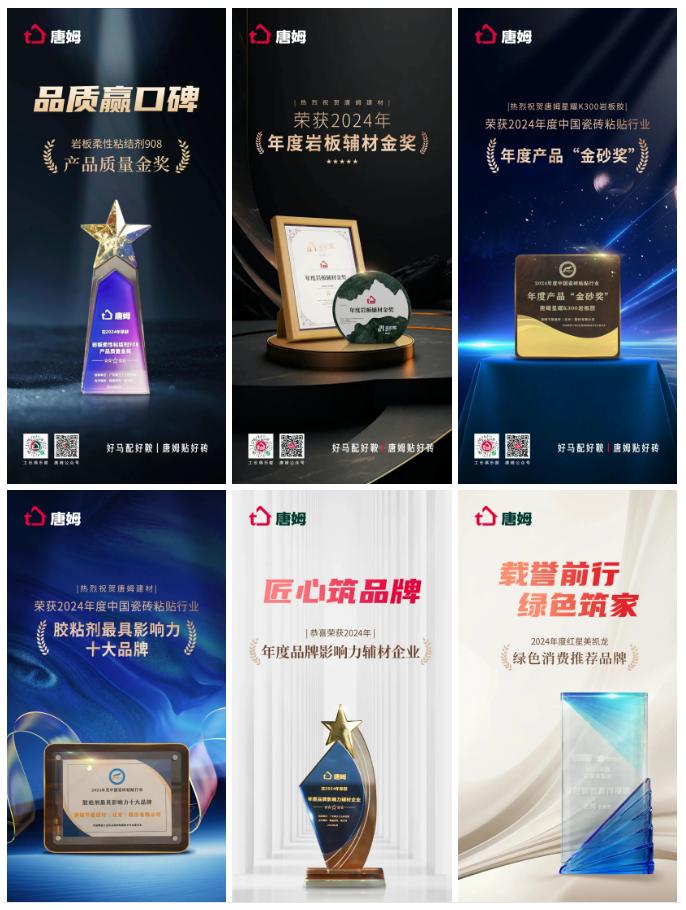 市场荣誉是对品质的最好褒奖。唐姆先后荣获"绿色消费推荐品牌"、"岩板柔性粘结剂908产品质量金奖"、"胶粘剂最具影响力十大品牌"等多项殊荣。其中,专为解决岩板铺贴难题而生的唐姆岩板胶,凭借超强粘结力和环境适应性,更是斩获金岩奖"年度岩板辅材金奖"等专业奖项。