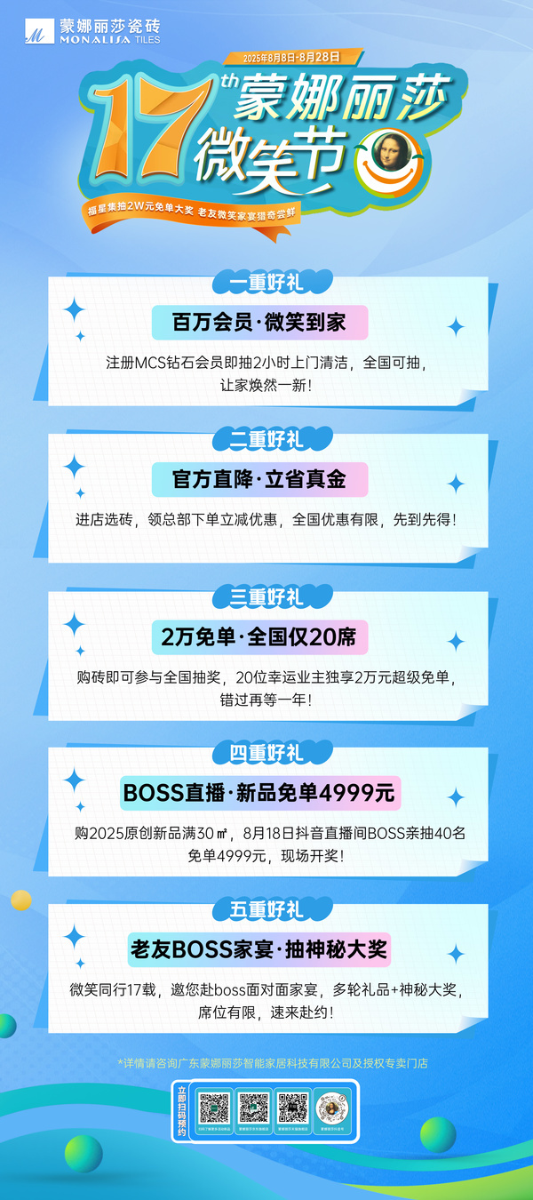 自创立以来,蒙娜丽莎瓷砖始终以匠心品质与创新设计为核心,致力于为万千家庭打造安全、美观、耐用的家居空间。第17届微笑节,无疑是蒙娜丽莎瓷砖回馈消费者信赖的诚意之作! 无论是最高两万元的超级免单减轻装修重负,还是立减200元的普惠福利、4999元的新品免单惊喜,乃至注册抽保洁、老友专属家宴等贴心服务,无不体现着品牌对用户全周期体验的重视。选择在年中装修黄金季推出,正是为了让消费者能以更轻松的姿态,开启理想新家的筑造之旅。