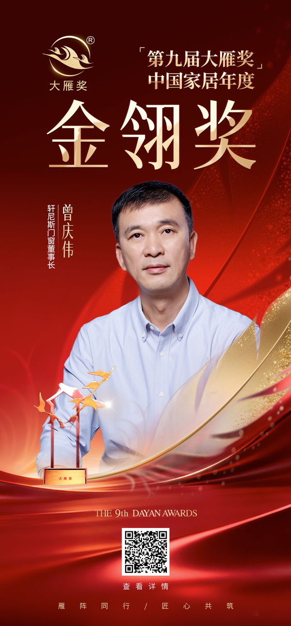 1月30日,「第九届大雁奖」获奖名单于云端发布会正式揭晓。轩尼斯门窗曾庆伟凭借其卓越的行业领导力、深刻的产业洞察力与非凡的开拓贡献,荣获“第九届大雁奖·中国家居年度金翎人物”这一行业个人最高荣誉。