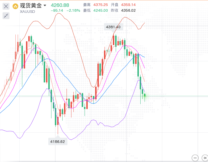 金价快速冲高后出现技术性回调(今天从4381美元跳水至4250美元附近),短期超买信号显著。