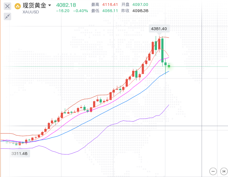 近期波动:过去两天(10月21-22日),现货黄金经历大幅下跌,单日跌幅一度超5%,创年内最大回调。目前金价在4083附近震荡,技术面进入调整阶段。
