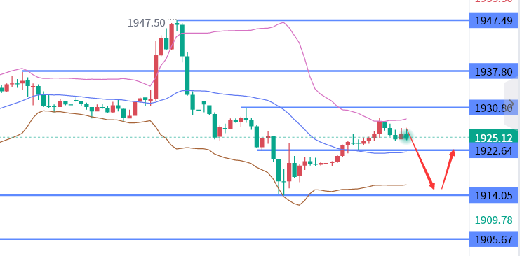首先,从技术图表来看:随着时间的推移,布林带在日线级别上逐渐收口,均线交织在一起,这表明市场处于震荡状态。本周的行情似乎更加震荡,前半周在1922美元上方震荡,向上冲刺1948区域,后半周冲高回落,向下破位并触及1913区域,现在又回到了中间价位1930上下。虽然高低点都触及了一边,但始终没有给出明确的多空方向偏向,这意味着今天的市场可能继续震荡,区间切换的情况仍有待观察。其次,从市场情绪方面来看:目前,投资者对美元持续坚挺的立场持谨慎态度,并对全球经济未来的预期充满不确定性。今日黄金操作思路上文承凯建议反弹高空为主,低多为辅,上方关注1930-37阻力,下方关注1919-1913的支撑;