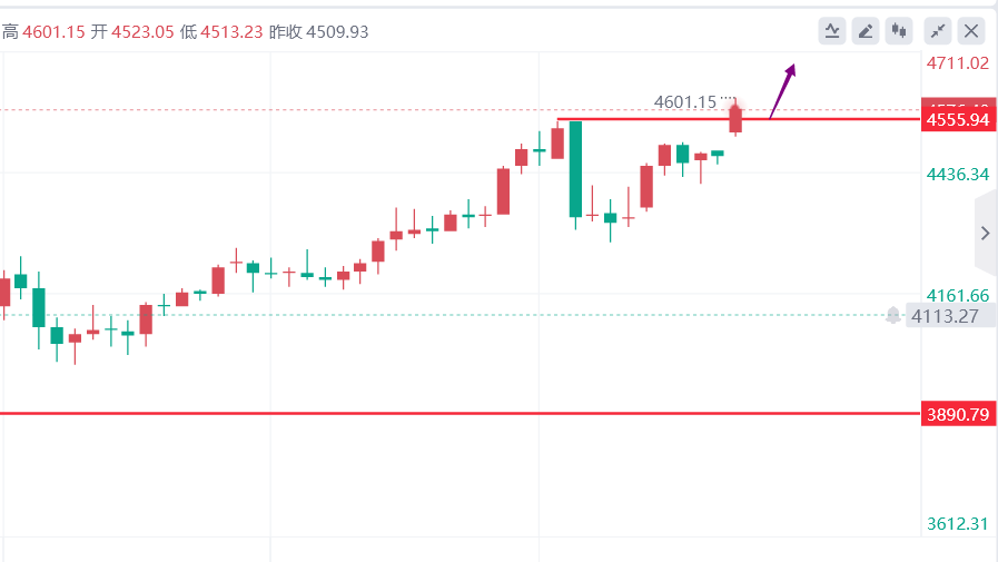 今日早盘黄金大幅拉升至4600美元附近,短线等待回调后仍以做多为主。下方4550美元一线已成为新的支撑位,这个突破后的顶底转换位就是多头进场的最佳参考点。下一站,文承凯瞄准4700-4800美元!中长期依然看涨!