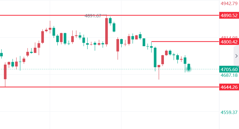 今日阻力支撑参考:下方支撑:4700—4650美元上方压力:4800—4850美元