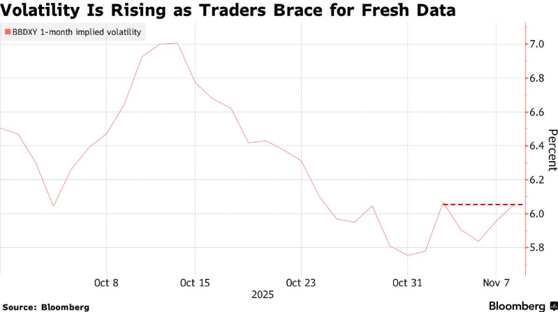 【随着美国参议院达成两党协议可能在未来几天结束史上最长停摆,与彭博美元现货指数挂钩的一个月期权合约成本已升至近一周最高水平。】