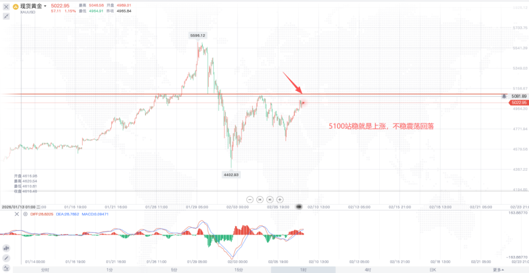 第一,看关键位置:黄金能不能反弹,核心看5150美元这个关键点位,只有突破了5150美元,后面的反弹才有机会、有持续性。