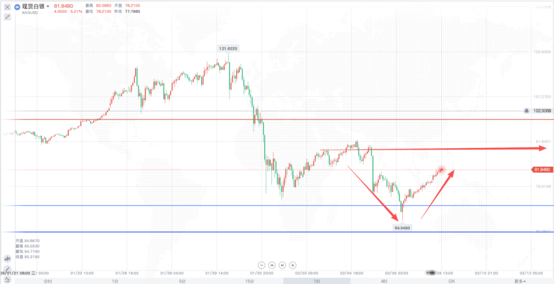 一般来说,资产快速下跌之后,二次反弹的时候,最理想的走势是形成双底或者W底(就是两次跌到差不多的位置就反弹,形成底部形态),而不是像现在这样,直接击穿之前的低点。所以在白银没有站上82-88美元之前,走势都不容乐观,大家千万别想着趁现在白银跌了,就高溢价抢购白银板料,性价比实在太低了,容易被套。