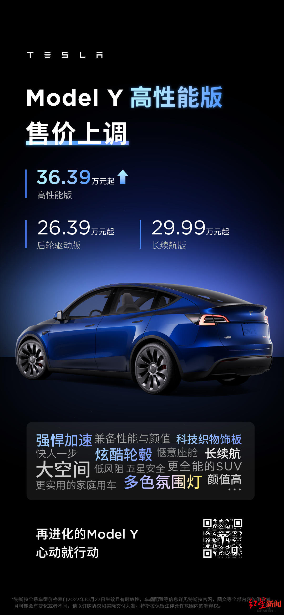 红星资本局10月27日消息,特斯拉(TSLA.US)中国官方微博宣布,即日起,Model Y 高性能版售价上调1.4万元,现价 36.39万元起。后轮驱动版、长续航版售价不变。