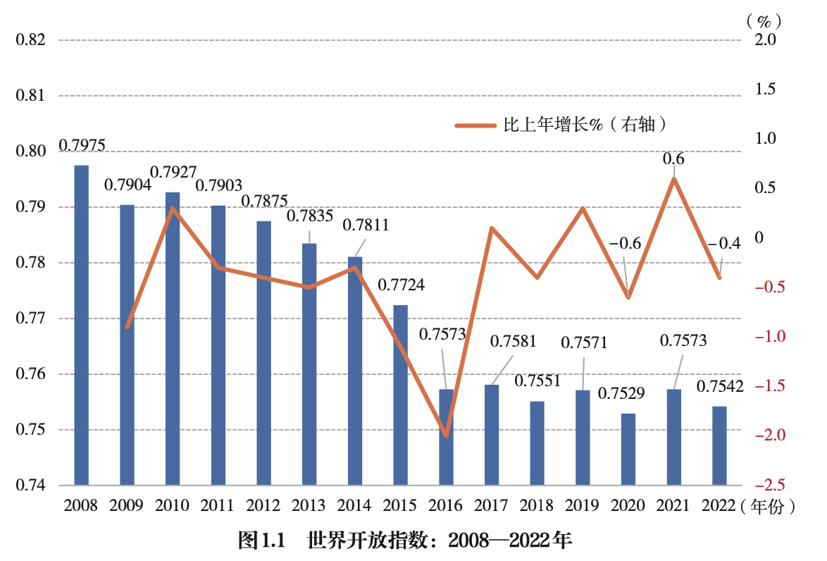 《世界开放报告2023》指出,世界开放整体走缓。2022年世界开放指数为0.7542,同比下降0.4%,比2019年下降0.4%,比2008年下降5.4%;2021年世界开放指数为0.7573,同比提高0.6%、略超2019年水平,比2008年下降5.0%。