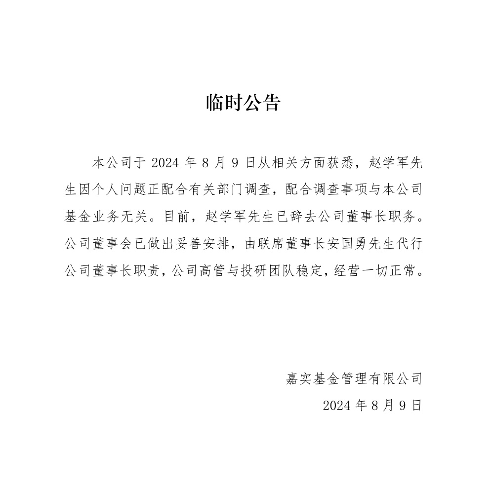 红星资本局8月9日消息,嘉实基金今日公告称,公司于2024年8月9日从相关方面获悉,赵学军因个人问题正配合有关部门调查,配合调查事项与本公司基金业务无关。目前,赵学军已辞去公司董事长职务。