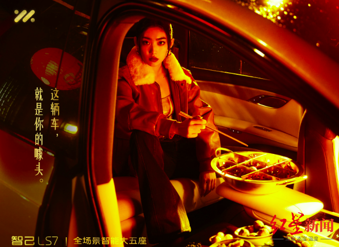 今年年初,智己汽车又发布了一张在车内吃火锅的海报。一名女模特手拿筷子坐在后排,面前摆放着九宫格火锅,配文“这辆车,就是你的噱头”,再次被网友质疑“为了场景而场景的营销”。