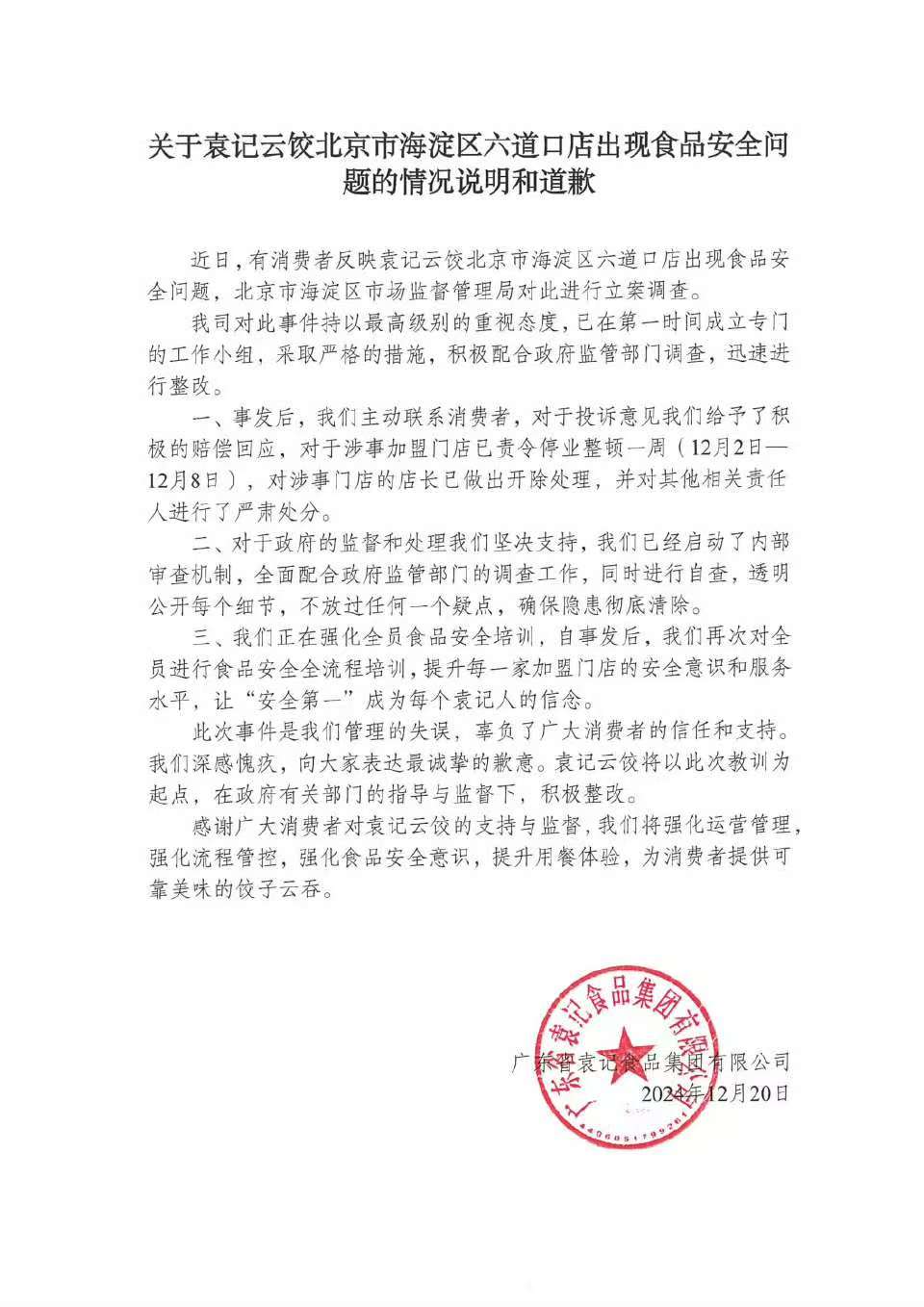 袁记云饺就此次事件致歉并称,此次事件是公司管理的失误,将以此次教训为起点,在政府有关部门的指导与监督下,积极整改。