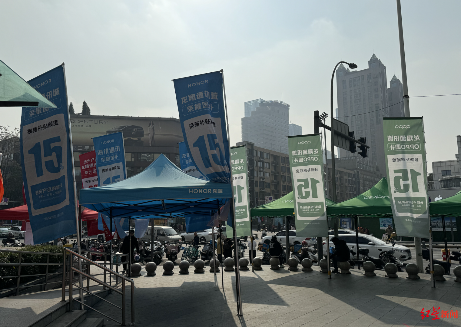 20日上午,红星资本局前往成都市赛格广场的龙翔通讯城实地探访,发现华为、荣耀、小米、苹果等手机品牌,都参与本次的国补活动。龙翔通讯城的大门口还贴着vivo、oppo、荣耀等品牌的国补宣传海报。