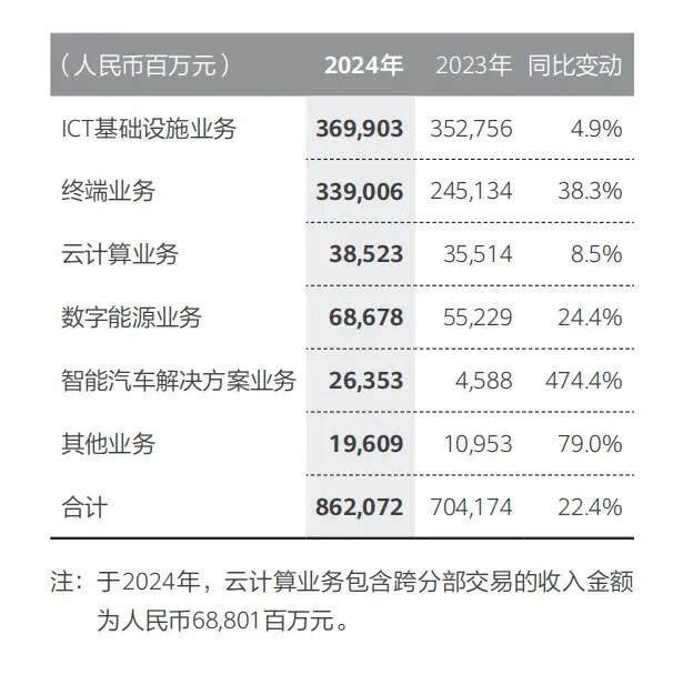 数据显示,华为智能汽车解决方案业务实现销售收入263.53亿元,同比增长474.4%;终端业务实现销售收入3390亿元,同比增长38.3%;云计算业务实现销售收入385.23亿元,同比增长8.5%;数字能源业务实现销售收入686.78亿元,同比增长24.4%;华为ICT(信息与通信技术)基础设施业务实现销售收入3699亿元,同比增长4.9%。