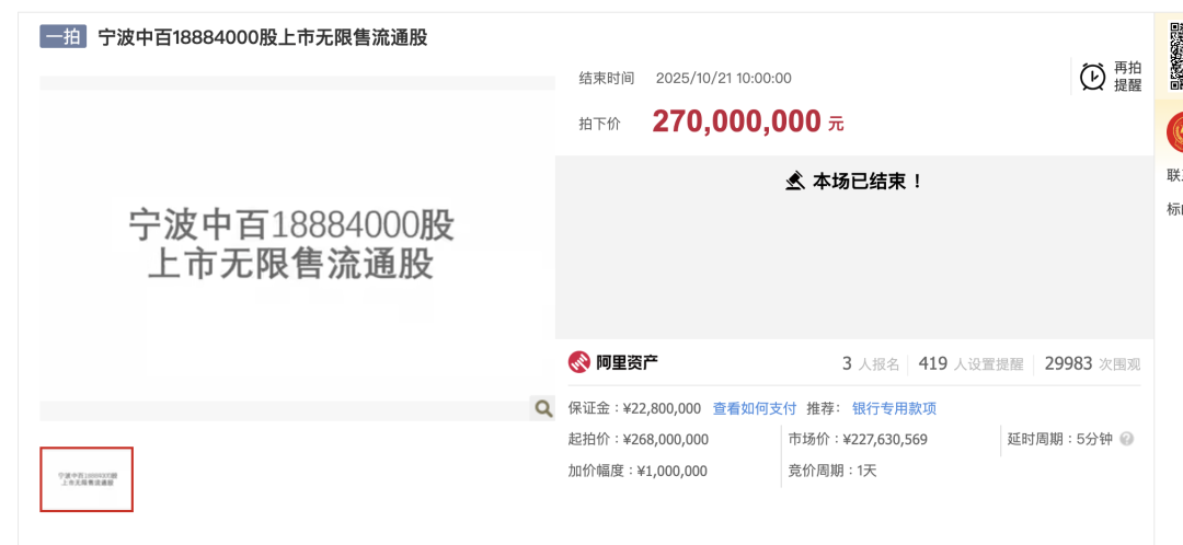 阿里司法拍卖平台显示,上述股权司法拍卖时间为2025年10月20日上午10时至2025年10月21日上午10时止。10月20日,本场法拍在杭州金帝加价之后便再无人出价,最终以2.7亿元的总价竞得宁波中百1888.4万股,折合为14.3元/股。
