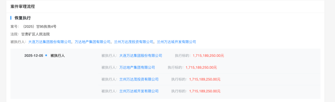 红星资本局12月8日消息,据天眼查,近日,大连万达集团股份有限公司、万达地产集团有限公司等新增1条恢复执行信息,执行标的17亿余元,执行法院为甘肃矿区人民法院。