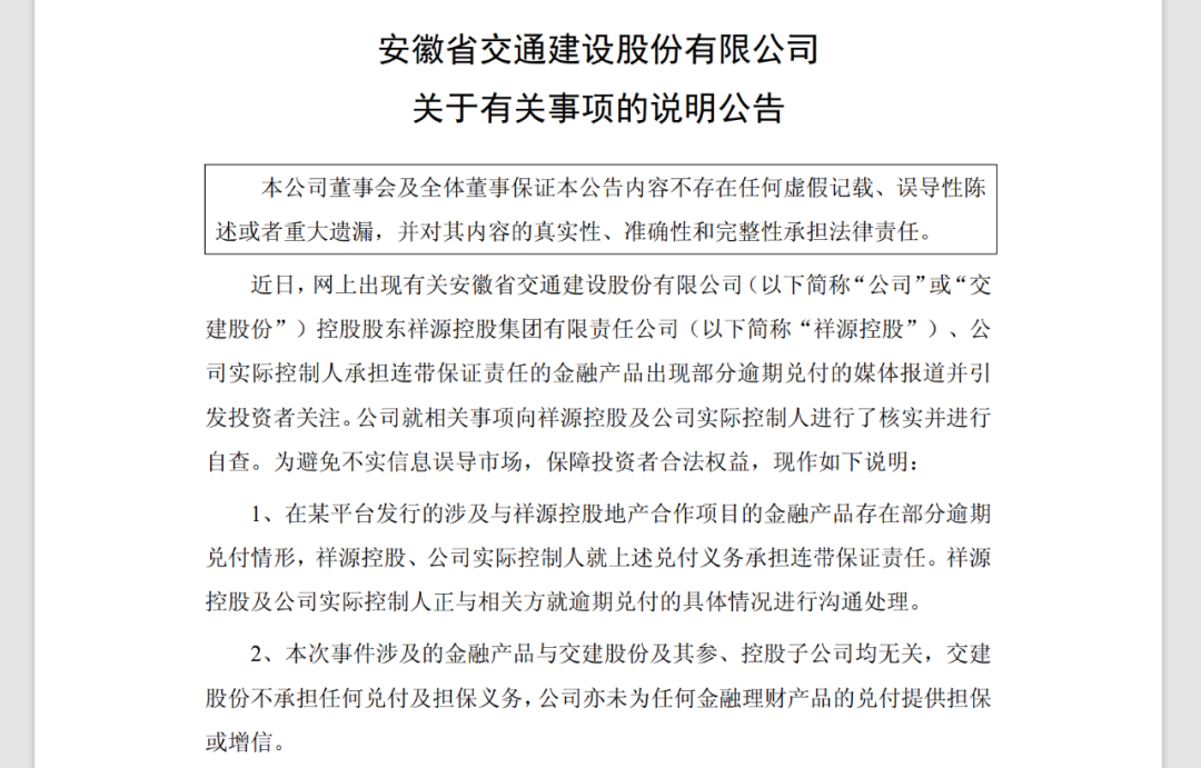 1、在某平台发行的涉及与祥源控股地产合作项目的金融产品存在部分逾期兑付情形,祥源控股、公司实际控制人就上述兑付义务承担连带保证责任。祥源控股及公司实际控制人正与相关方就逾期兑付的具体情况进行沟通处理。