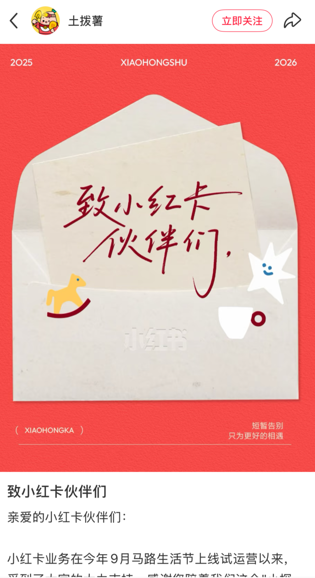 红星资本局12月9日消息,日前,小红卡团队在小红书上发布公告称,“小红卡”将于2026年1月1日起暂停试运营。