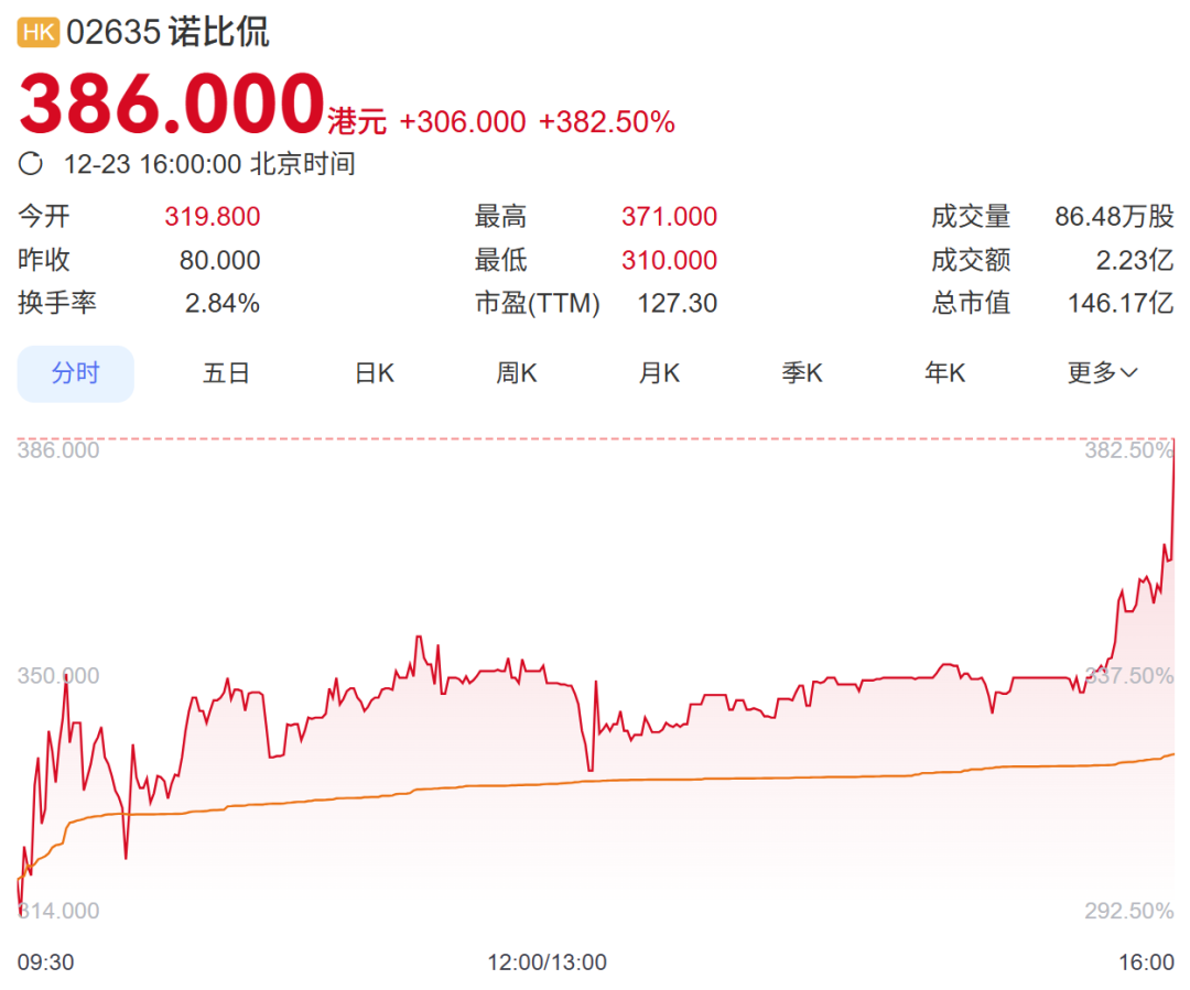 截至收盘,诺比侃大涨382.5%,报386港元/股,总市值146.17亿港元。
