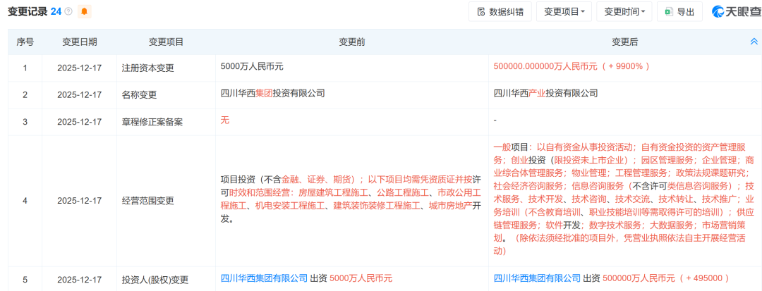 天眼查工商信息显示,近日,四川华西集团投资有限公司发生工商变更,企业名称变更为四川华西产业投资有限公司,注册资本由5000万人民币增至50亿人民币,增幅9900%。