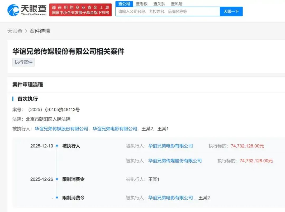 红星资本局12月29日消息,天眼查APP显示,近日,华谊兄弟电影有限公司、华谊兄弟传媒股份有限公司(300027.SZ)及两公司法定代表人王忠磊、王忠军被限制高消费,涉及7473万元执行案件,执行法院为北京市朝阳区人民法院。