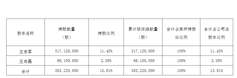 债务泥潭中,华谊兄弟实控人王忠军、王忠磊股份均已被轮候冻结,并被进行拍卖。公告显示,两兄弟所持股份累计被冻结的比例已经达到100%,被冻结股份占公司总股本的比例合计为13.81%。