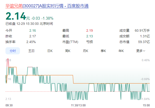 资本市场上,华谊兄弟近年来股价持续走低。截至12月29日收盘,华谊兄弟报2.14元/股,股价下跌1.38%,目前总市值59.37亿元,较2015年巅峰时期的近900亿元大幅缩水。