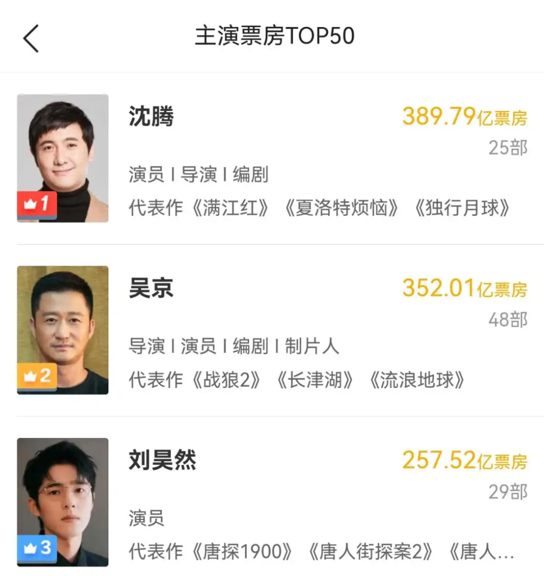 随着《飞驰人生3》的热映,演员沈腾的主演电影票房累计已突破389.79亿元,登顶主演票房榜第一,吴京和刘昊然紧随其后。目前,《飞驰人生3》的预测票房为42.75亿元,沈腾有望凭本片成为首位主演电影票房破400亿元的演员。