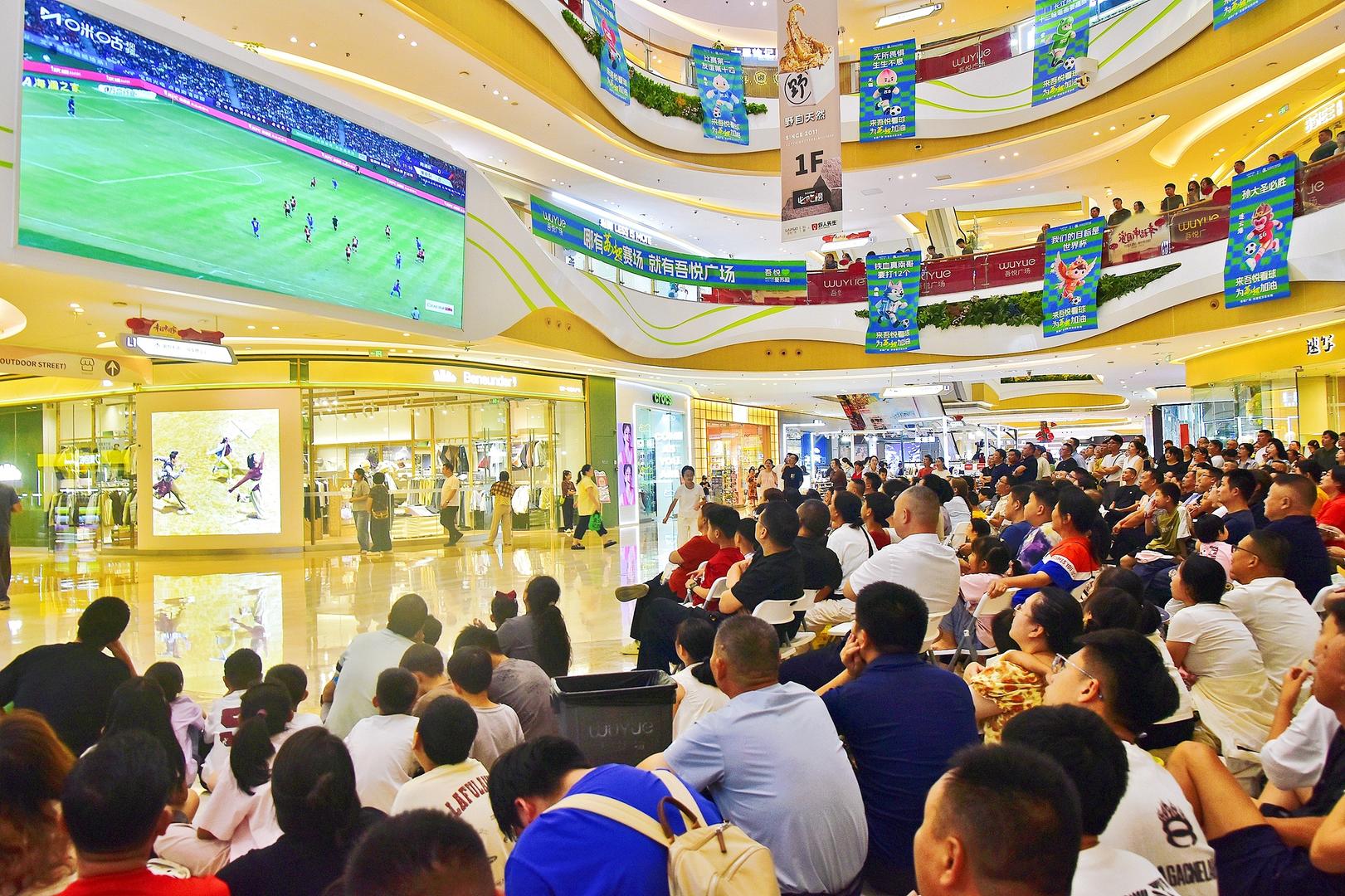 2025年10月7日,江苏南通,市民在如皋市吾悦广场内观看“苏超”比赛。图据视觉中国