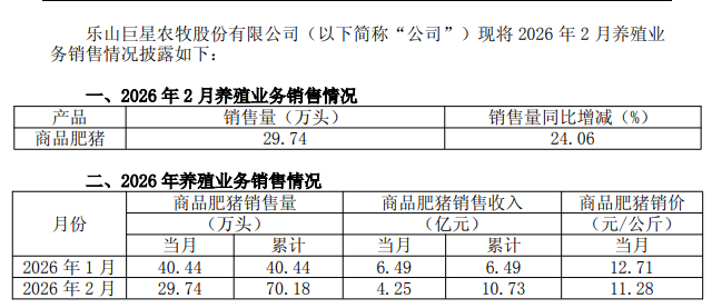 微成都报道 3月9日,巨星农牧(603477.SH)披露2026年2月养殖业务销售情况。公司2月商品肥猪销售量29.74万头,同比增长24.06%;商品肥猪销售收入4.25亿元,商品肥猪销价11.28元/公斤。