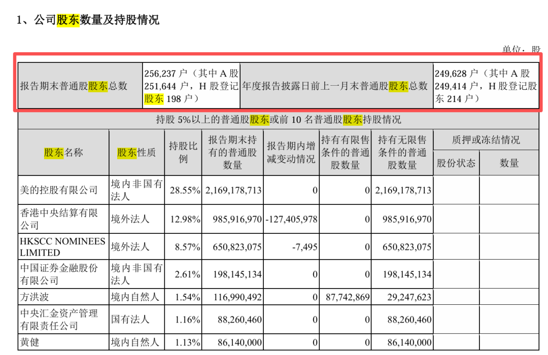 截至报告期末,美的集团普通股股东总数为256237户,其中A股251644户,H股登记股东198户。