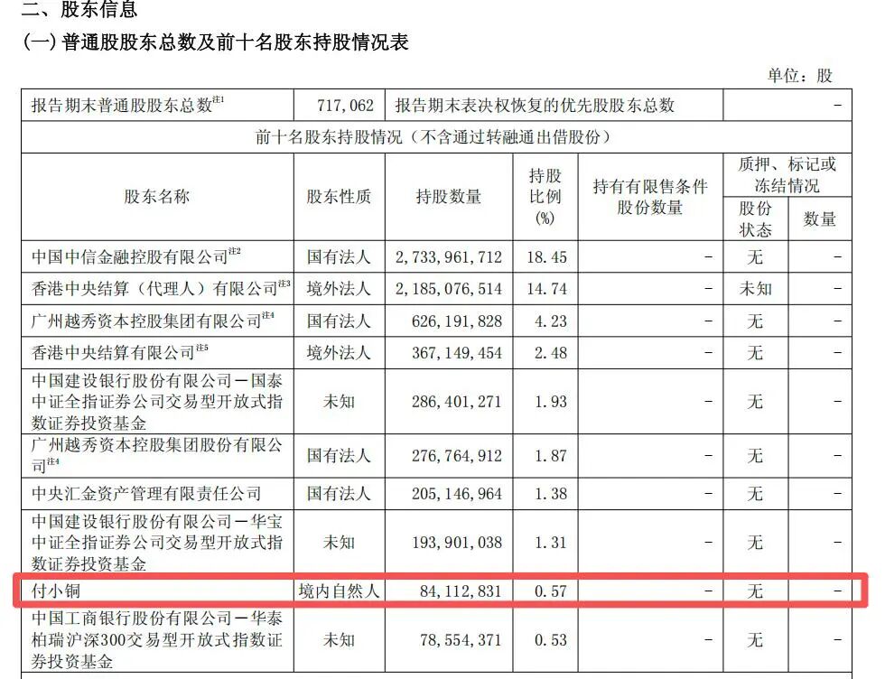 时隔11年,中信证券前十大股东再现自然人,付小铜成第九大股东
