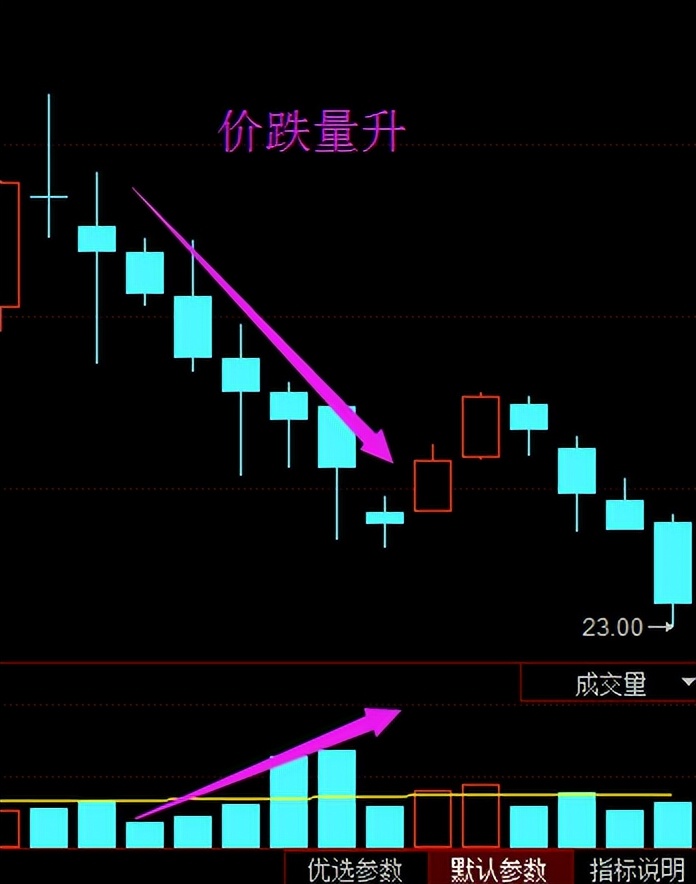 4、 价跌量增:价跌量增主要是指个股在股价下跌的情况下成交量反而增加的一种量价配合现象。说明价格与成交量的关系。价跌量增是一种典型的短线价量背离的现象。恐慌情绪蔓延,价格下跌时不断卖出,大部分出现在下跌行情的初期,也有小部分出现在上升行情的初期。