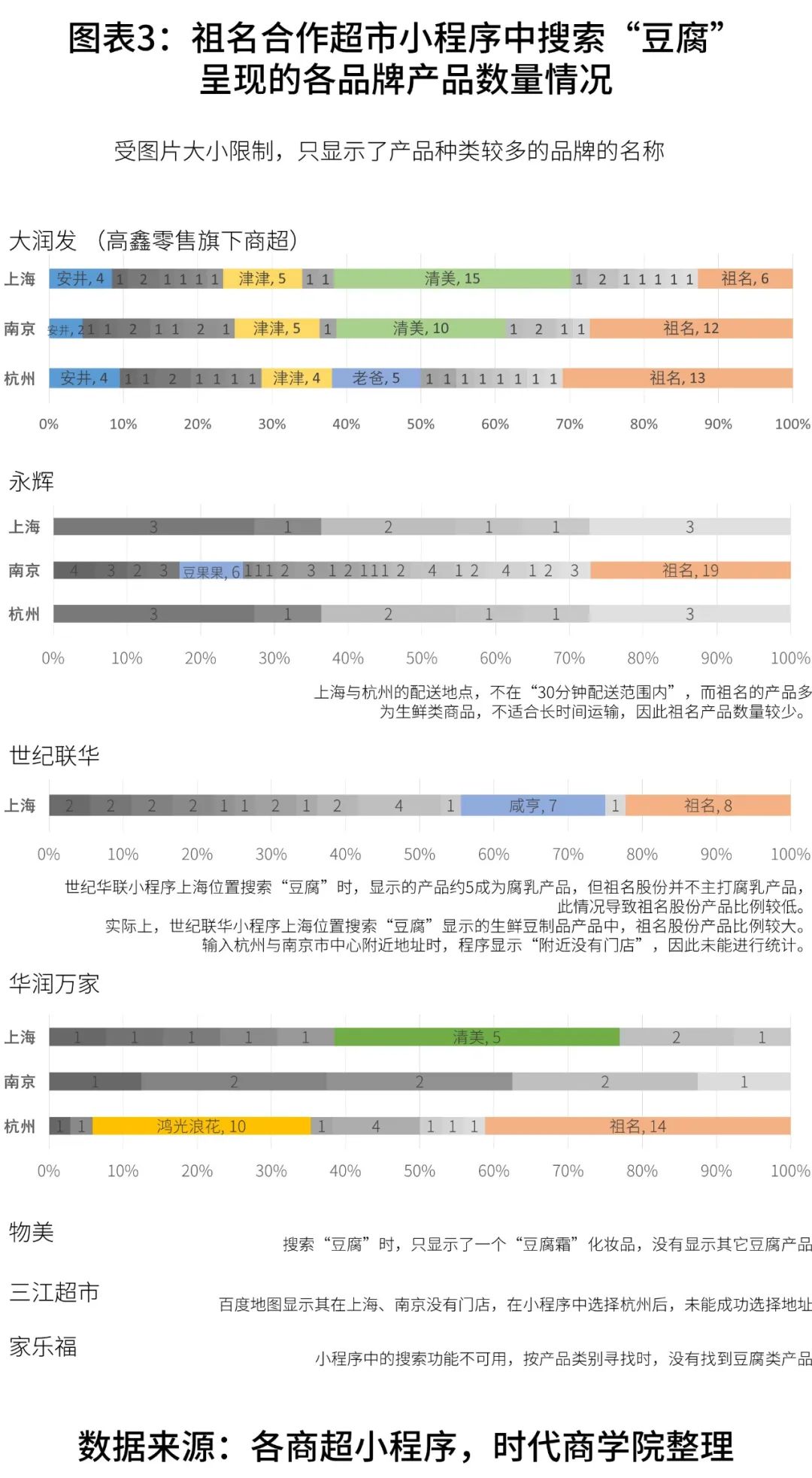 资料显示,祖名股份董事长蔡祖明出身于浙江省萧山西兴的“豆腐世家”,祖上三代卖豆腐。他从家庭式小作坊做起,逐渐做成杭州本土品牌。据祖名股份官网,该公司成立于2000年,现已成为包含生鲜豆制品、休闲豆制品、植物蛋白饮品等400多种单品的全系列豆制食品生产企业。对于商超渠道,祖名股份在2021年年报中表示,公司目前客户涵盖高鑫零售、永辉、世纪联华、华润万家、物美、三江超市、家乐福等大中型超市。时代商学院登录上述超市的小程序,分别选择上海、杭州、南京的市中心地铁交会区域(大世界地铁站、建国北路地铁站、新街口地铁站)作为配送区域,搜索关键词“豆腐”,统计祖名股份产品在豆腐类产品中的比例。在三大城市的商超小程序中,祖名股份产品占比较大的商超分别有大润发南京、大润发杭州、世纪联华上海、华润万家杭州,产品数量比例分别是27.27%、30.95%、22.22%、41.17%,产品占比均没有过半。其中,在大润发南京与华润万家杭州两大商超中,祖名股份的产品数量虽然最多,但与排名第二的品牌相比,在数量上并无太大优势。在其他商超中,祖名股份产品种类的比例也不大。例如,在大润发上海,品牌清美有15个产品在售,而祖名股份只有6个;在华润万家上海,清美有5个产品在售,而祖名股份没有产品在售。从各大商超小程序列示的产品厂家信息来看,祖名股份显然不是独家供应商;从产品数量占比来看,祖名股份仅在2家商超的占比超30%,在部分门店甚至没有产品在售。值得注意的是,尽管祖名股份的产品线丰富,商超小程序中在售的各品牌豆制品产品,祖名股份都有同类产品,但未能出现在上述商超中。例如,在祖名股份产品数量占比最大的华润万家杭州,商超选择由鸿光浪花供应“软香玉豆腐干”与“臭豆腐”,而祖名股份的同类产品“祖名软香玉”与“祖名臭豆腐”并没有在售。在祖名股份产品数量占比较低的大润发上海,该商超选择由清美供应内酯豆腐、绢豆腐、小油豆腐、玉子豆腐、豆腐皮,祖名股份的同类产品也没有在售。在产品同质化严重的当下,祖名股份又将如何脱颖而出?值得一提的是,祖名股份还陷入转基因、防腐剂超标等丑闻。据媒体报道,祖名股份生产的豆腐皮产品曾被检测发现有转基因成分,彼时该公司董秘高锋对检测结果未提出异议;另外,“祖名”牌臭豆腐也于去年因检出防腐剂标示不合格被监管机构通报。