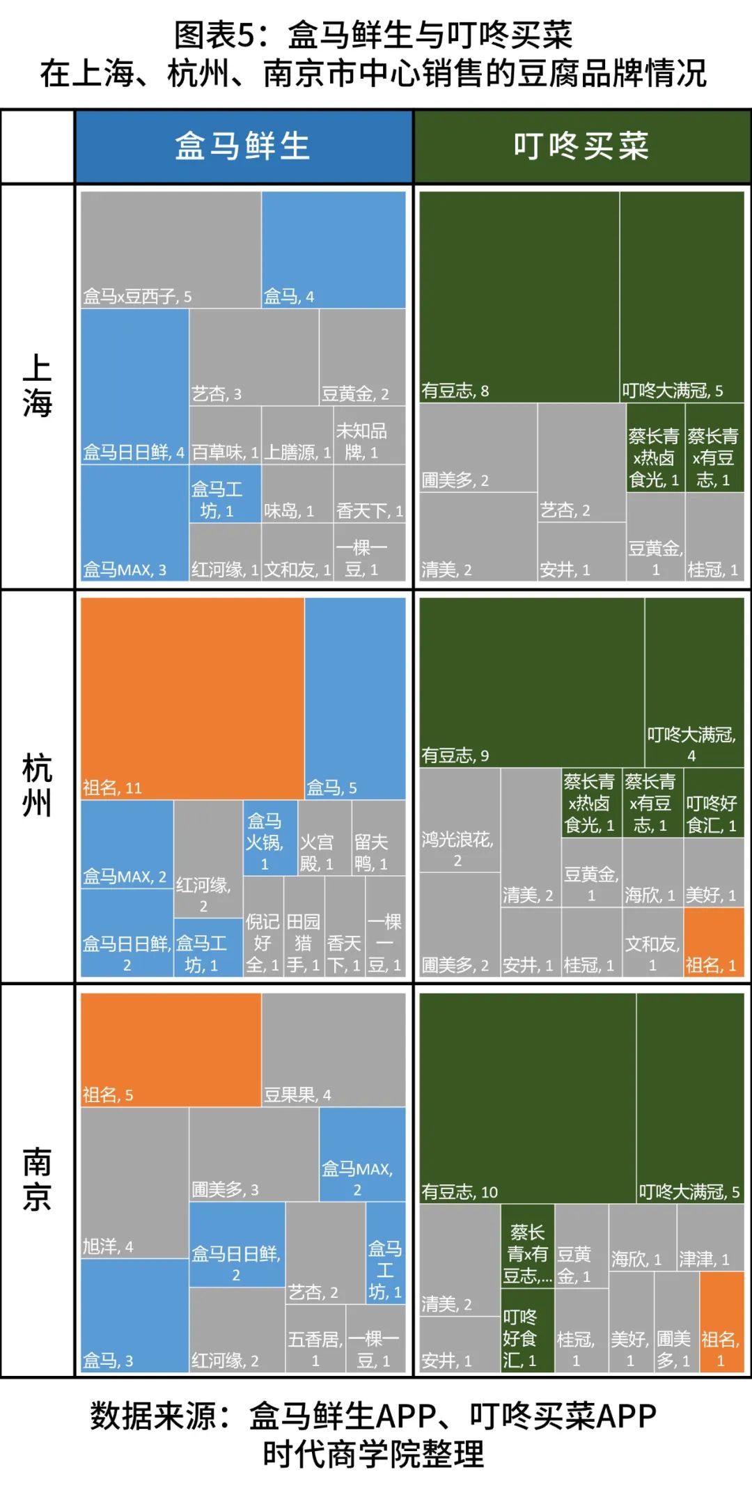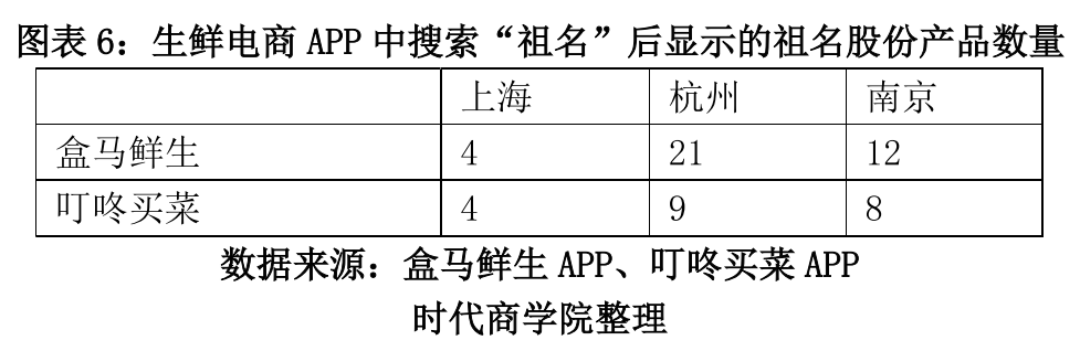 对于生鲜专营电商平台渠道,祖名股份在2021年年报中表示,其客户包括盒马鲜生、叮咚买菜、每日优鲜(MF.O)等。时代商学院发现,每日优鲜APP已不能连接其服务器。2021年年报显示,2021年,每日优鲜净亏损为38.49亿元。另据多家媒体于今年7月的报道,每日优鲜APP在北京、上海、天津、杭州等地已无法下单。对于盒马鲜生、叮咚买菜,时代商学院登录其APP,并选择上海、杭州、南京的市中心区域作为配送区域,搜索关键词“豆腐”,统计祖名股份产品在豆腐类产品中的比例。在图表5中,橙色方框代表祖名股份的产品,蓝色方框代表盒马鲜生的自营产品,绿色方框代表叮咚买菜的自营产品。在叮咚买菜APP中,搜索“豆腐”后显示的产品数量约为30个,时代商学院将其全部记录。对于盒马鲜生APP,搜索“豆腐”后显示的数量远超30个,时代商学院仅记录了前30个豆腐产品的情况。上述操作对各品牌产品所占比例的影响较小。对于盒马鲜生,其在杭州地区销售祖名股份的产品较多,在信息流前30个产品中有11种,占比为36.67%;但在上海与南京地区,搜索“豆腐”后APP展现的前30个产品中,祖名股份的产品数量分别为0个、5个,占比分别为0%、17.78%。对于叮咚买菜,祖名股份的在售产品数量更少。在杭州与南京地区,搜索“豆腐”后APP呈现的信息流中仅出现1个祖名股份的产品;在上海地区,APP没有出现祖名股份的产品。需注意的是,盒马鲜生和叮咚买菜都已建立自营品牌销售豆制品。盒马鲜生拥有自营品牌盒马、盒马MAX、盒马x豆西子、盒马工坊、盒马火锅、盒马日日鲜,上述自营品牌均销售豆制品。叮咚买菜拥有自营品牌豆志、蔡长青x热卤食光、蔡长青x有豆志、叮咚大满冠、叮咚好食汇,上述自营品牌也均销售豆制品。从数量看,生鲜电商平台自营豆制品品类数量远超祖名股份等第三方供应商(见图表5)。从产品在信息流中的位置看,平台自营豆制品品类的展示位置往往较好。从这个角度看,拥有渠道优势的生鲜电商客户有较强的意愿往上游延伸。祖名股份等第三方供应商存在极大的被替代风险,在生鲜电商平台的地位岌岌可危。为求严谨,时代商学院还在生鲜电商APP中搜索“祖名”,记录祖名股份的所有产品的总数量。祖名股份在2021年年报中表示,其拥有400余种产品,但在盒马鲜生与叮咚买菜的生鲜电商平台中,祖名股份的产品最多只有21种。由此看来,祖名股份产品的种类虽多,但大部分都没有进入生鲜电商销售渠道。另外,由于豆制品产品的生产技术壁垒较低,产品可替代性高,下游客户更换供应商不存在较大难度。未来,若生鲜电商平台大客户扩大豆制品自营品牌,或寻找其他供应商,将对祖名股份的业绩带来较大不利影响。