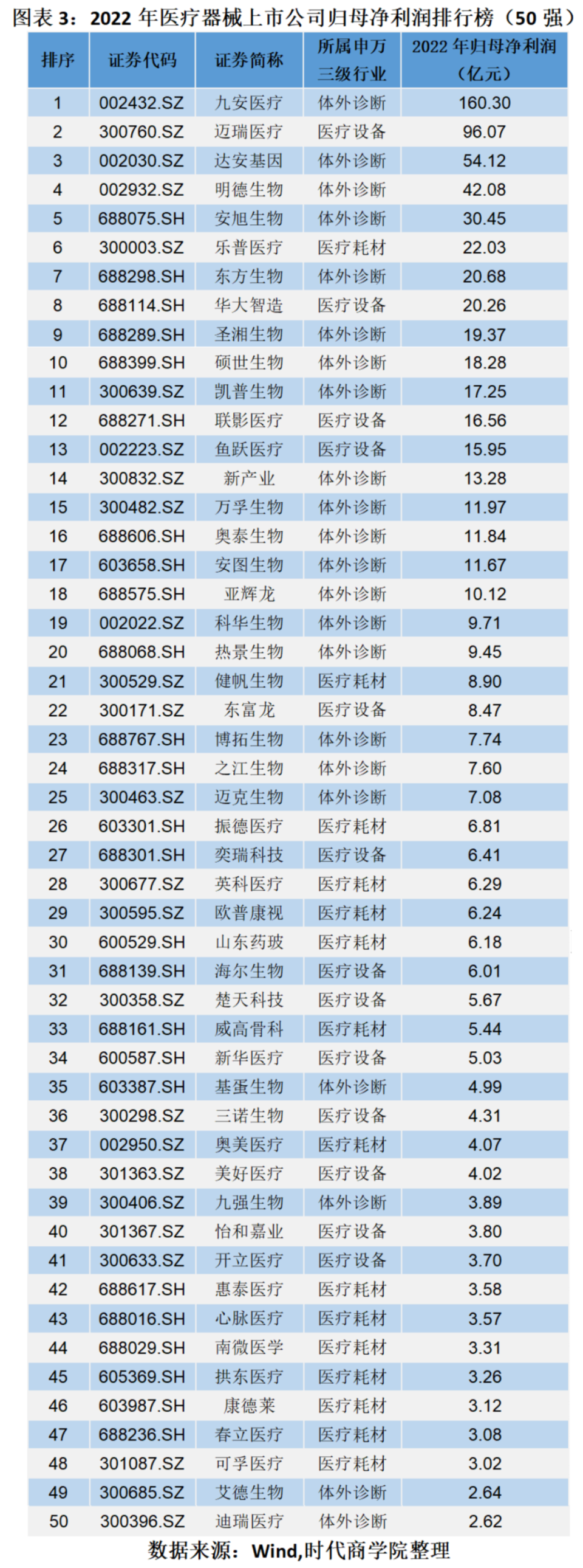 具体企业方面,九安医疗(002432.SZ)、迈瑞医疗(300760.SZ)、达安基因(002030.SZ)分别以160.3亿元、96.07亿元、54.12亿元成为2022年归母净利润规模前三强。
