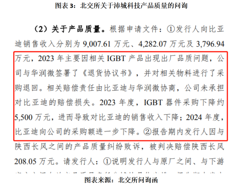 北交所在问询函中指出,2023年,由于沛城科技向华润微(688396.SH)采购的IGBT产品出现出厂品质问题,两者签署了《退货协议书》,对相关物料进行采购退回。作为比亚迪的供应商,沛城科技未承担对比亚迪的赔偿责任,而是让比亚迪与华润微就相关赔偿责任进行协商。2023年,沛城科技对华润微IGBT器件的采购额下降了约5500万元,进而导致对比亚迪的销售收入下降。